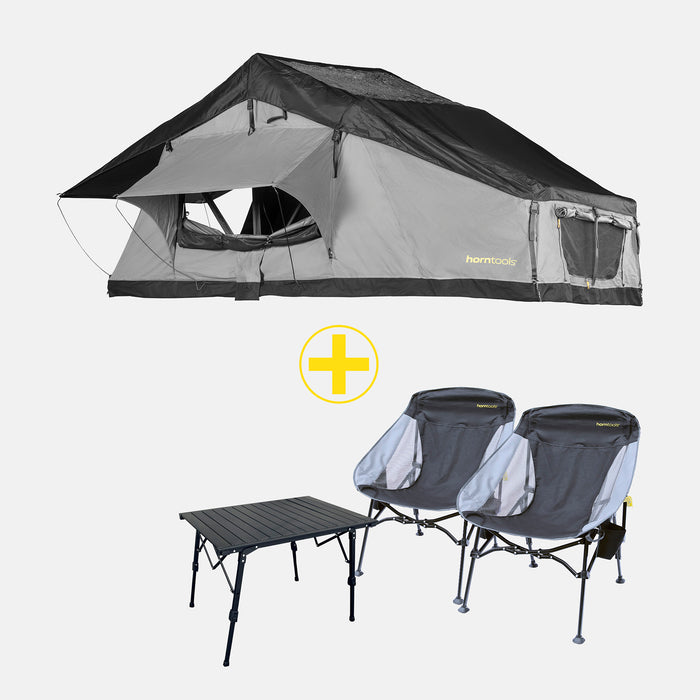 Avec l'Elements Stone Bundle Bronze, tu combines notre tente de toit Elements Stone éprouvée (disponible en différentes tailles) avec le set de meubles de camping horntools composé de deux chaises et d'une table de camping compacte.