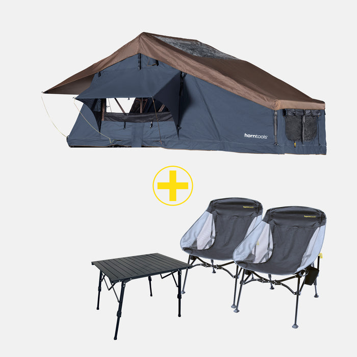 Mit dem Elements Ocean Bundle Bronze kombinierst du unser bewährtes Dachzelt Elements Ocean Gen II (in verschiedenen Größen erhältlich) mit dem horntools Campingmöbel-Set bestehend aus zwei Stühlen und einem kompakten Campingtisch.